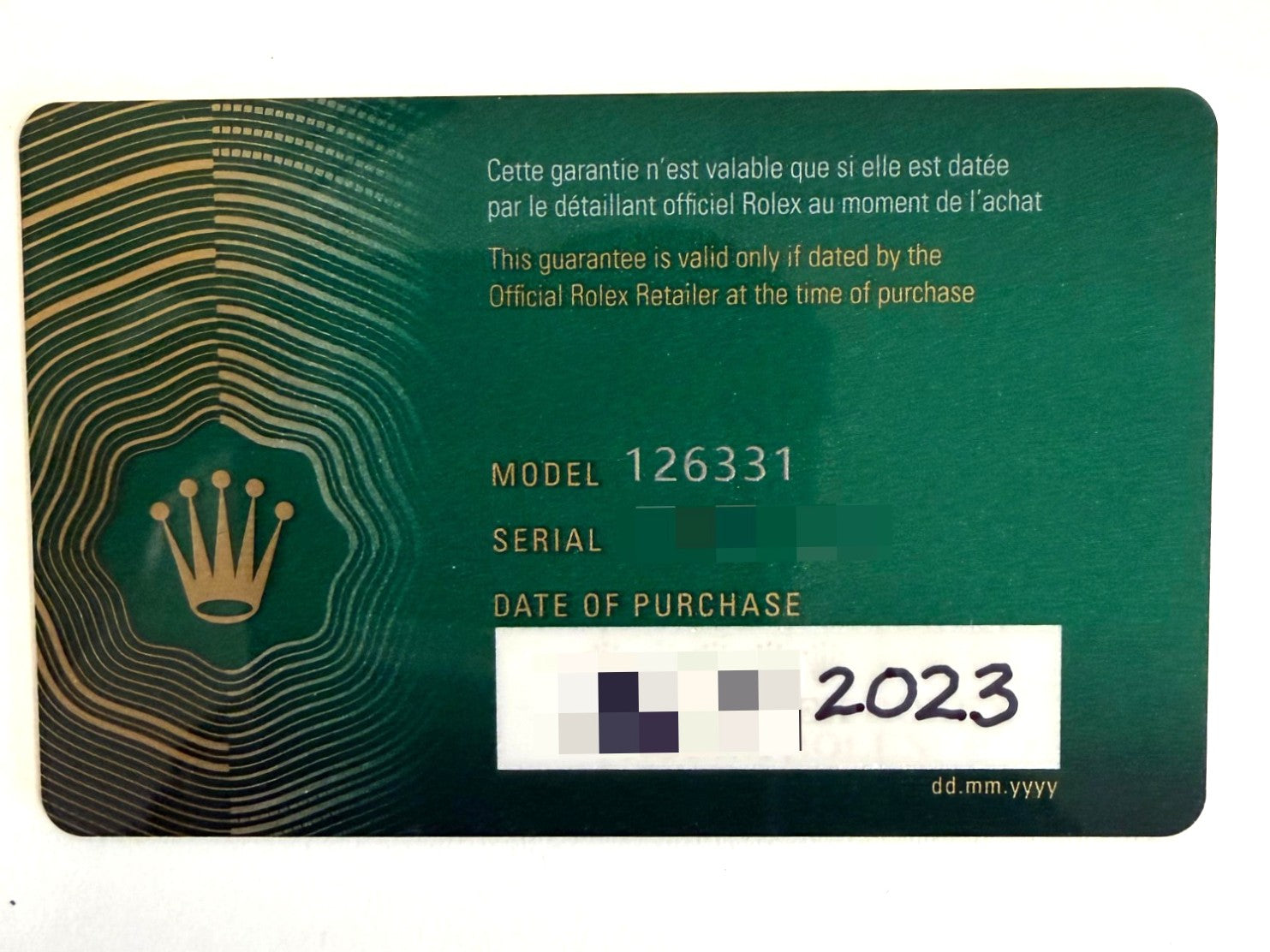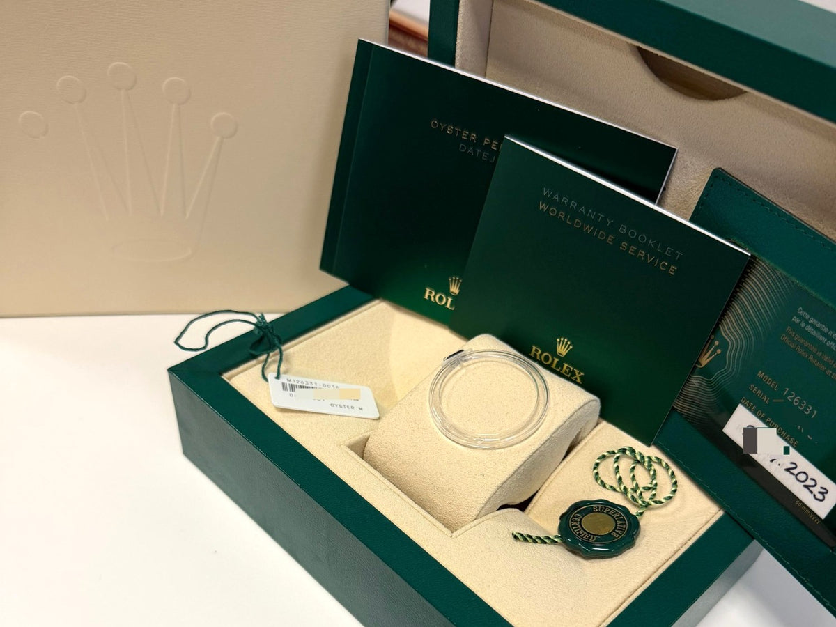 This 2023 example is in Mint Condition, showing no visible signs of wear. It comes with full bracelet links and remains under Rolex factory warranty, offering added peace of mind. The watch is complete with the factory Rolex box and papers (as pictured), including the original hang tag and bezel protector, further enhancing its completeness and collector appeal.