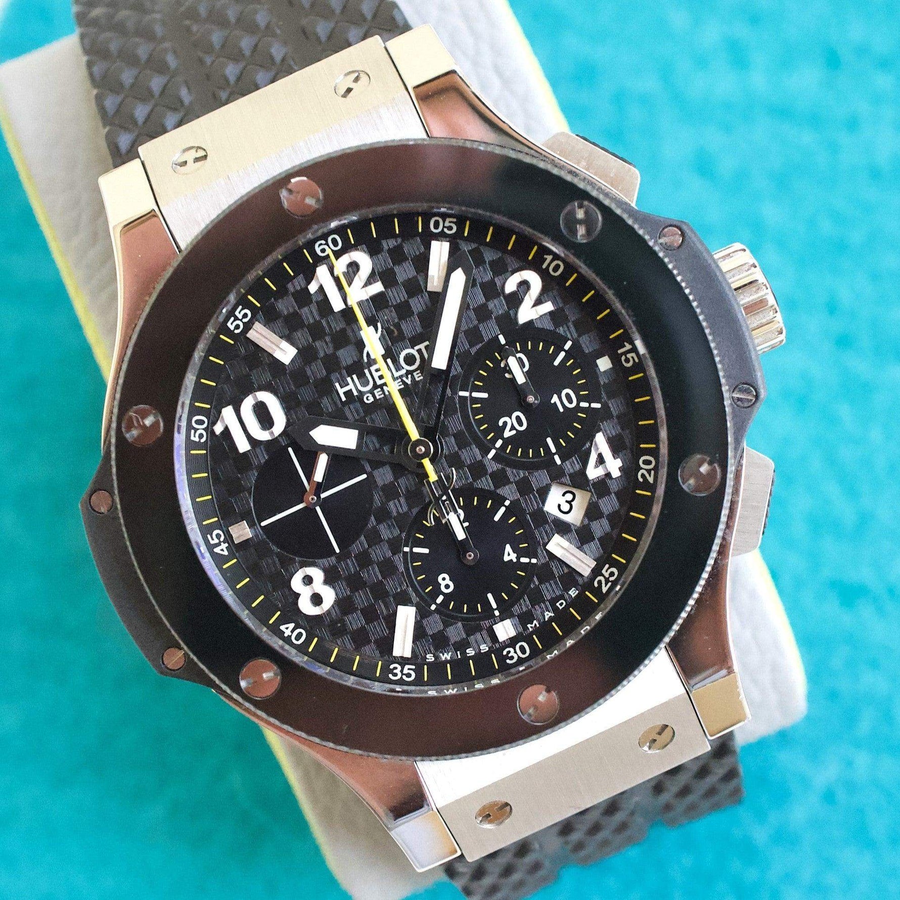 The Hublot Big Bang 301.SB., part of the Big Bang collection that debuted in 2005, revolutionized the watchmaking industry with its bold, innovative design and integration of unusual materials. This model, known for embodying Hublot's philosophy of "fusion," combines high-grade stainless steel with black ceramic, creating a striking contrast that has become a signature look for the brand. The 301.SB. is special because it features Hublot's distinctive 44mm case with a complex, layered construction that offers a dynamic, three-dimensional appearance. It houses the Hublot HUB4100 movement, an automatic chronograph mechanism that provides functionality as well as aesthetic appeal through its skeletonized date wheel. The use of a black ceramic bezel, resistant to scratches and fading, along with a textured rubber strap, enhances its sporty yet luxurious appeal, making it highly popular among watch enthusiasts who appreciate contemporary design paired with advanced watchmaking techniques. The Hublot Big Bang 301.SB. exemplifies modern horology with its avant-garde approach to materials and design, standing out in the luxury watch market.