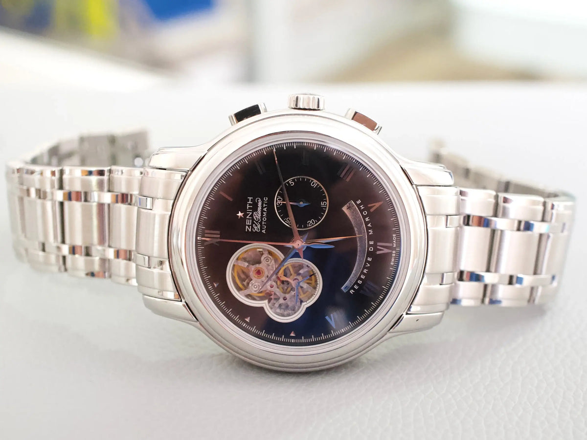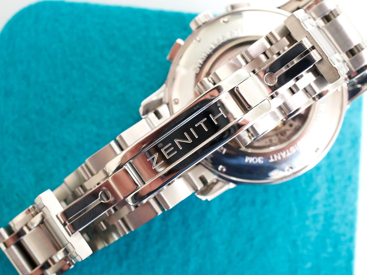 This example is in Mint Condition, complete with the full factory bracelet links, making it suitable for wrists of nearly any size. The watch runs on Zenith’s high-beat El Primero movement, renowned for its precision, smooth chronograph operation, and rich horological heritage.