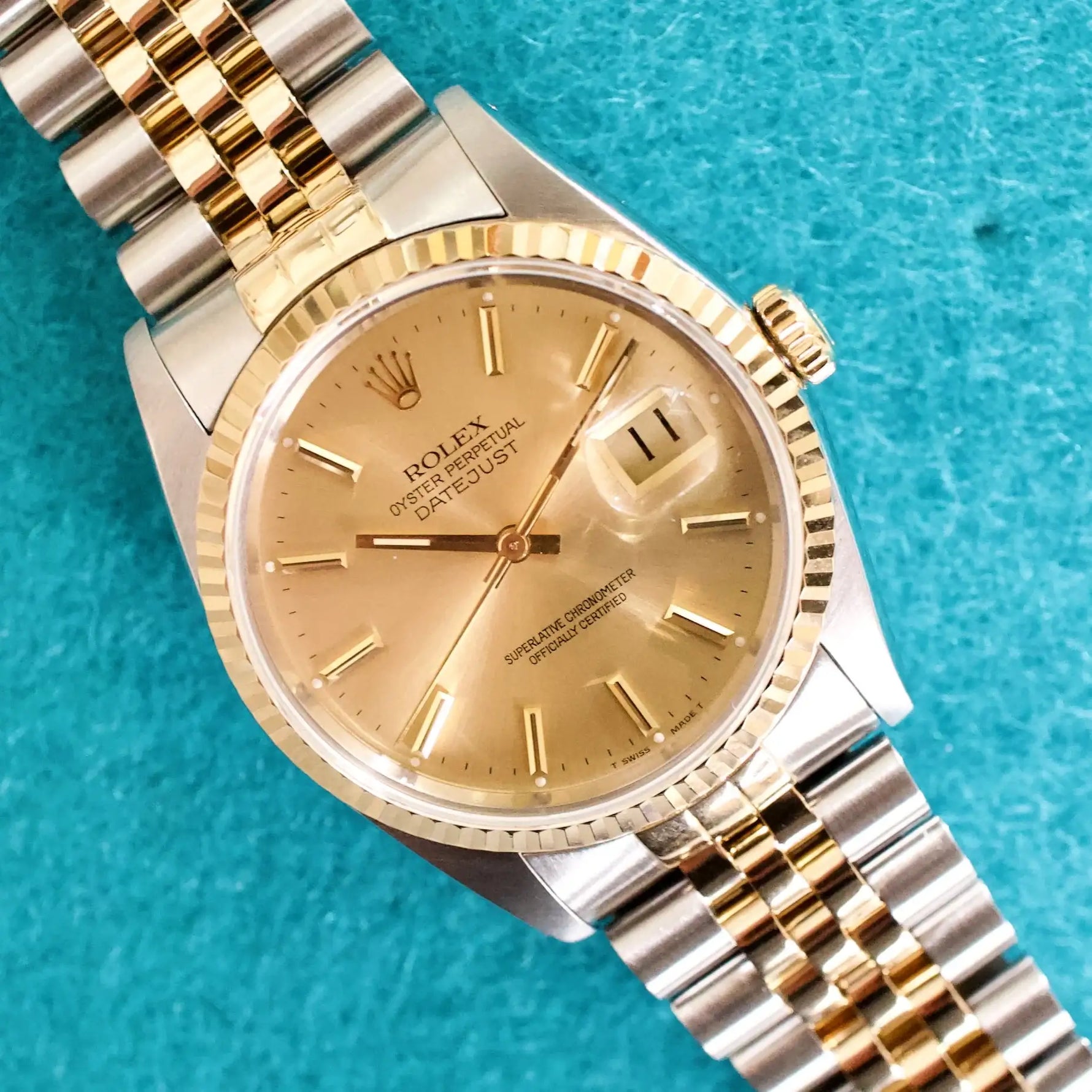 SOLDOUT: Rolex Datejust 16233 36MM Automatic 18k Gold Bezel Two-Tone Champagne Dial Box 1989