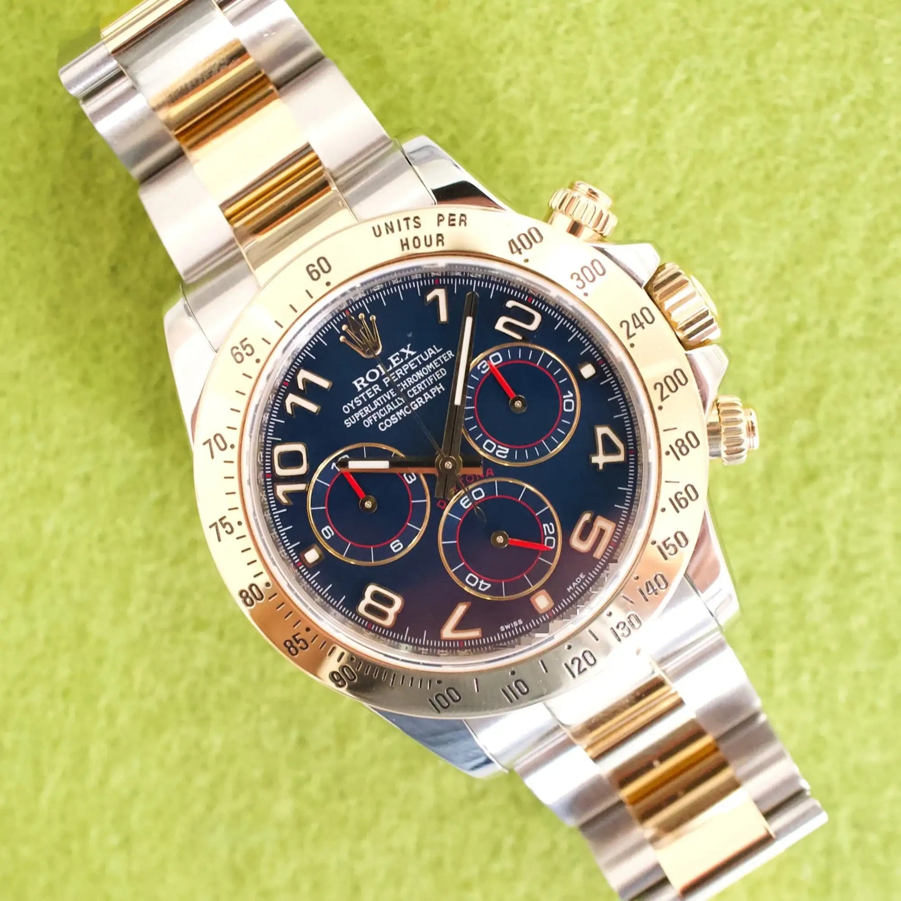 This is an authentic Rolex Daytona, a standout example of the iconic chronograph in two-tone steel and 18K yellow gold. The vibrant blue racing dial adds a sporty, high-performance edge to its otherwise classic aesthetic, while the 40MM case and two-tone Oyster bracelet offer timeless Rolex appeal and solid wrist presence.