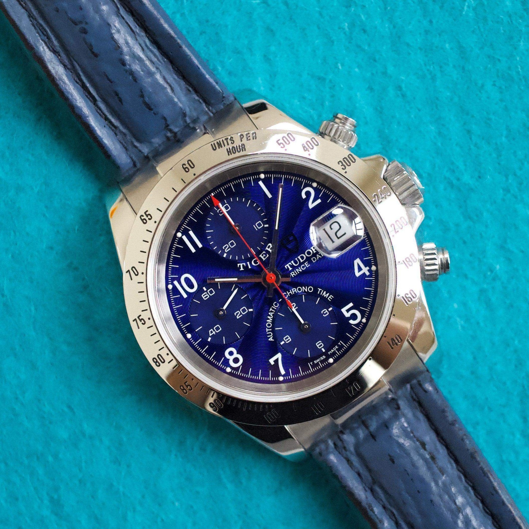 The Tudor Prince Date 79280P, part of the Tudor Prince Chronograph series, was introduced in the late 1990s and reflects Tudor's rich history of producing robust, functional timepieces inspired by Rolex’s designs. This model, often referred to as the "Tudor Chronograph Tiger," stands out for its sporty yet elegant appeal, combining a 40mm stainless steel case with polished lugs and a fixed bezel engraved with a tachymeter scale for measuring speed. Powered by the reliable ETA 7750 automatic chronograph movement, it offers precision timing along with a date function at 3 o’clock. What makes the 79280P special is its versatility and connection to motorsport, often associated with golf legend Tiger Woods during Tudor's partnership with him in the early 2000s. Its combination of heritage, durable design, and functional chronograph features makes it a favorite among enthusiasts seeking a classic, high-performance timepiece.