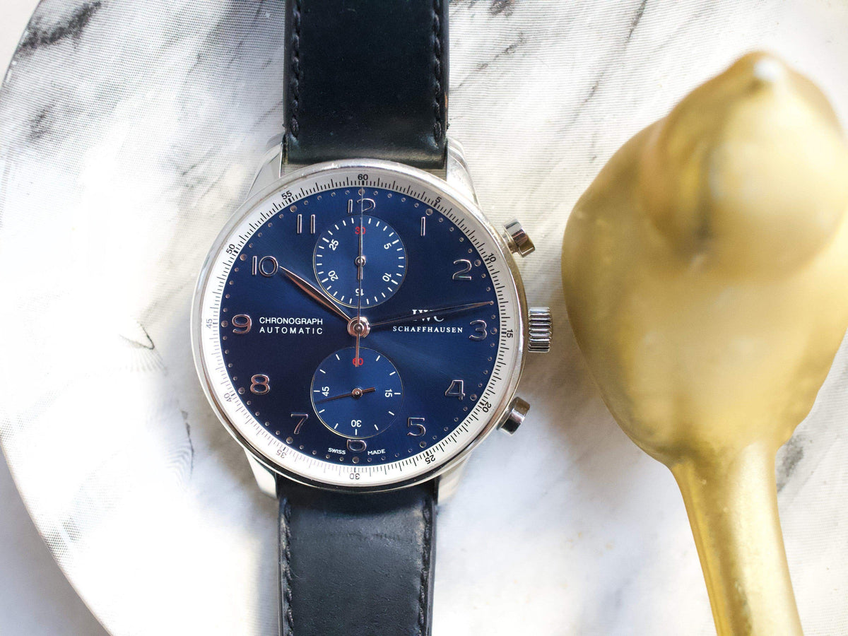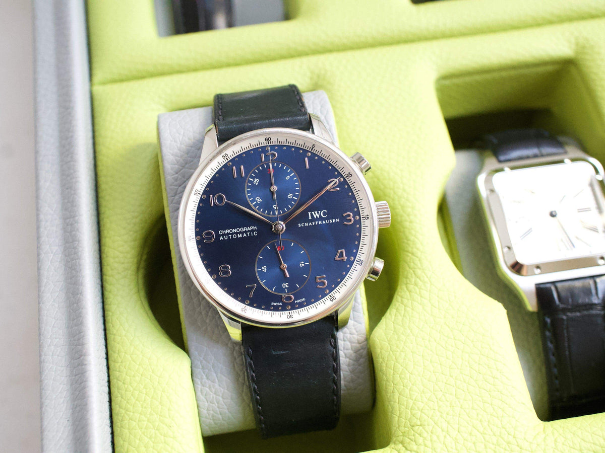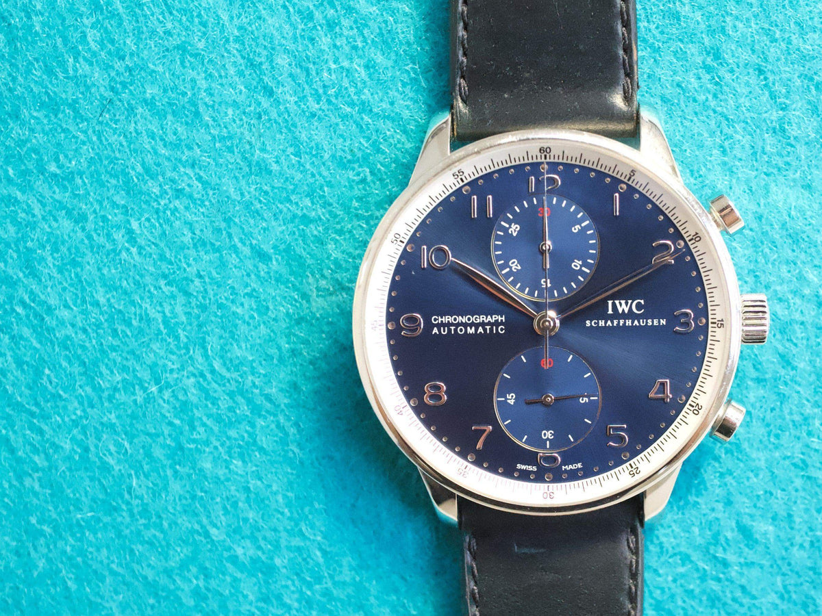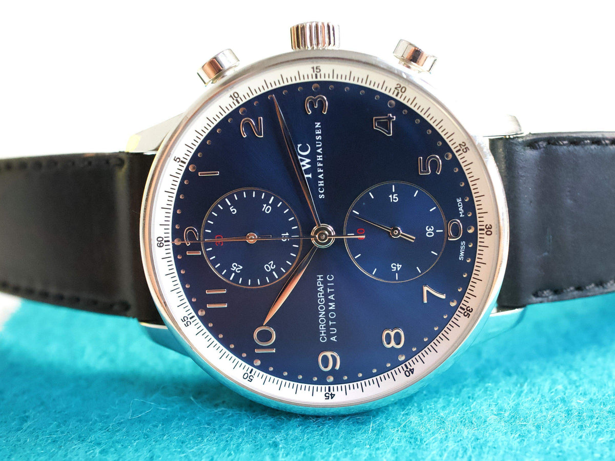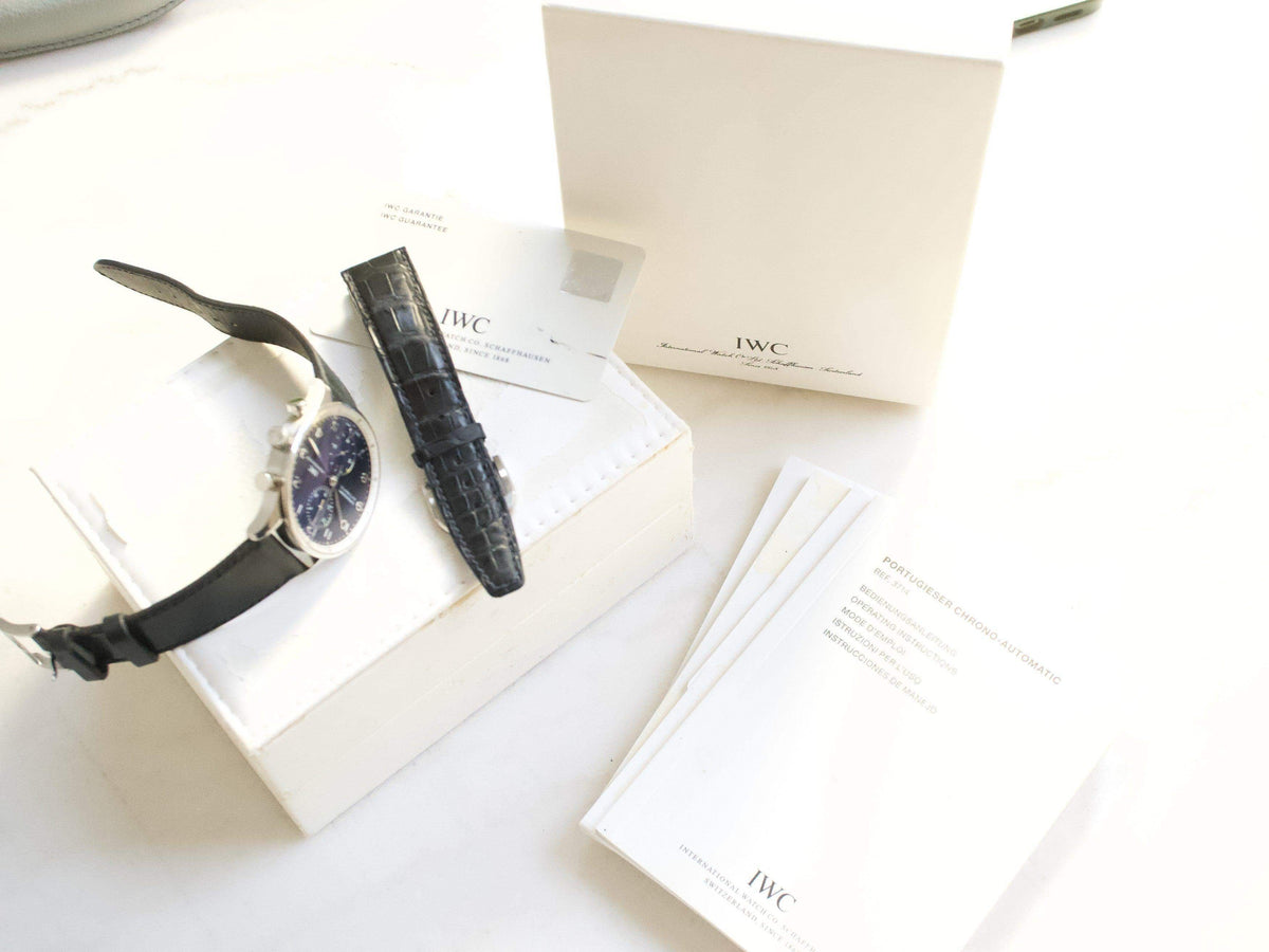 The IWC Portuguese Chronograph IW371432 is a distinguished member of the IWC Portugieser collection, a line inspired by nautical instruments and introduced in the 1930s to meet the demand for precise, elegant wristwatches. This model, featuring a 41mm stainless steel case and a stunning silver-plated dial with gold-tone Arabic numerals and hands, exemplifies the timeless design and functionality that define the Portugieser line. Powered by the reliable IWC Caliber 79350, a chronograph movement based on the robust Valjoux 7750, it offers precise timing and a clean, symmetrical layout with two subdials for seconds and a 30-minute counter. What makes the IW371432 special is its blend of classic maritime-inspired aesthetics with modern watchmaking reliability, making it a versatile choice for those who appreciate understated elegance and precision engineering. Its timeless design ensures it remains a favorite among enthusiasts and collectors alike.